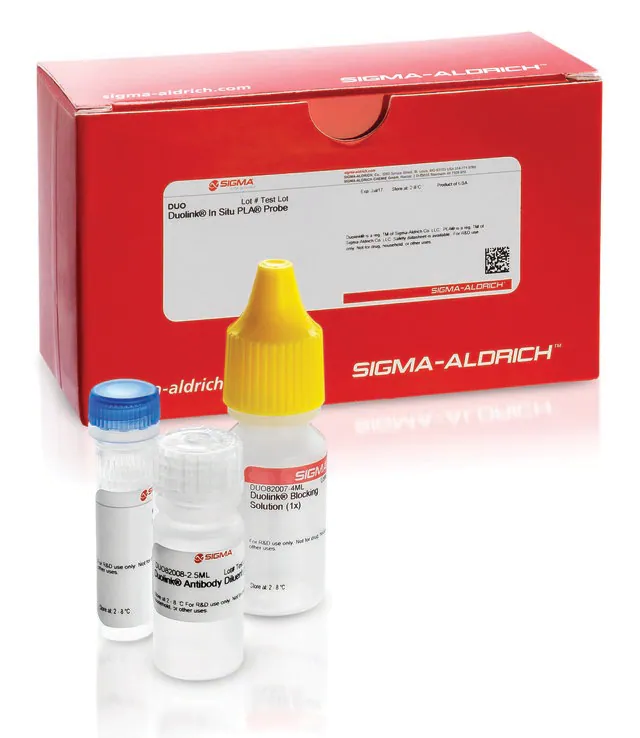 | Application【应用】 | Duolink®邻位连接技术(PLA®) 能够在单分子水平下在固定细胞和组织样品中对蛋白质相互作用、翻译后修饰和蛋白质表达水平进行内源性检测。 该产品适用于 Duolink® 原位荧光检测方案 和 Duolink® 原位明场检测方案 ,具体取决于所用的检测试剂。 请访问我们的 Duolink® PLA资源中心 ,了解有关Duolink® 实验、应用、故障排除等方面的信息。 想要完成Duolink® PLA 原位 实验,您将需要两种一抗 (经过PLA、IHC、ICC或IF验证) 以识别两个目标表位。其他必需试剂包括来自不同物种的一对PLA探针(一个PLUS和一个MINUS)、检测试剂、洗涤缓冲液和封固剂。请注意,一抗必须来自与Duolink® PLA探针相同的物种。使用标准免疫荧光测定设备进行分析。HRP也可用于明场检测。 特异性 PLA探针抗小鼠抗体与全分子小鼠IgG以及其他小鼠免疫球蛋白的轻链反应。PLA探针抗小鼠抗体可能与兔抗发生交叉反应,但与牛、鸡、山羊、豚鼠、叙利亚仓鼠、马、人、兔和绵羊血清蛋白质具有极小的交叉反应性。 与本产品同时使用的PLUS探针必须来自不同物种。有关更多信息,参见我们的 产品选择指南 。 应用说明 需要使用来自不同物种的两种一抗。在标准免疫荧光(IF)、免疫组织化学(IHC)或免疫细胞化学(ICC)测定中测试一抗(IgG类,单克隆或多克隆),以确定最佳的固定、封闭和滴度条件。Duolink®PLA 原位 试剂适用于固定细胞、细胞离心涂片细胞、载玻片上生长的细胞、福尔马林固定石蜡包埋(FFPE)样本或组织(新鲜或冷冻)。无最少细胞数量限制。 让我们帮您完成工作,了解有关 定制服务计划 的更多信息,加速您的Duolink® 项目 查看完整的Duolink® 产品列表 |