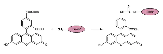 | Principle【原理】 | Sigma提供方便的试剂盒用于制备FITC-标记抗体。异硫氰基荧光素(FITC),异构体1,是一种广泛使用的荧光团,因为在共轭反应时它有高量子效率和稳定性。FITC具有黄橘色的颜色以及在495 nm处的最大吸光值。通过激发,它可以散发出在525 nm具有最大发射的黄绿色。通过蛋白质或多肽链的自由氨基基团发生共轭反应,形成稳定的硫脲键(看反应)。FITC和抗体,凝集素,激素和生长因子共轭,用于各种免疫组织化学和流式细胞仪实验中。该实验方案对于抗体是最优方案,但用于其他蛋白质时需要用户自行修改。 |