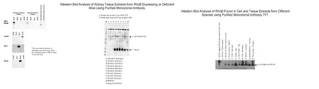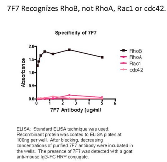 | Application【应用】 | Anti-RhoB, clone 7F7, Cat. No. MABS1990, is a mouse monoclonal antibody that detects Rho-related GTP-binding protein RhoB in human and has been tested for use in ELISA and Western Blotting. Western Blotting Analysis: A 1:2,000 dilution from a representative lotdetected RhoB in 10 µg of MCF7 cell lysate. Western Blotting Analysis: A representative lot detected RhoB in mouse and rabbit spleen, mouse kidney, recombinant RhoB, 293 cells expressing RhoB, CHO, H9C2, PK1P.185, COS, MDA MB-231, MCF7 and chicken fibroblasts (Courtesy of Lisa Laury-Kleintop, Ph.D., Lankenau Institute for Medical Research, Philadelphia PA, USA). ELISA Analysis: A representative lot detected RhoB in Plate bound recombinant RhoB (Courtesy of Lisa Laury-Kleintop, Ph.D., Lankenau Institute for Medical Research, Philadelphia PA, USA). Research Category Signaling |