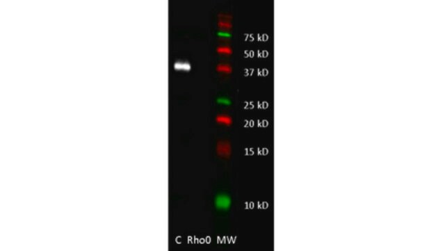 | Application【应用】 | Western Blotting Analysis: 4 µg/mL from a representative lot detected MT-ND4 in mitochondria from Human Neonatal Dermal Fibroblasts and mitochondria from Human neonatal dermal fibroblasts depleted of mtDNA. (Courtesy of Michael F. Marusich, Ph.D., mAbDx, Inc., Eugene, OR, USA). Anti-MT-ND4, clone 9E4-2D8, Cat. No. MABS1994,is a mouse monoclonal antibody that detects NADH-ubiquinone oxidoreductase chain 4 and has been tested for use in Western Blotting. |