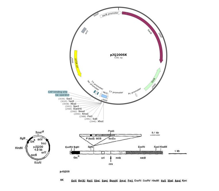 Suicide vector permitting gene replacement and mobilization into a wide range of Gram negative bacteria. Allows positive selection for integration. Replicates only in enterobacteria, and so functions as a suicide vector in other Gram negative hosts. When induced by media containing 5% sucrose, sacB is lethal in a wide range of Gram negative bacteria, and thus permits selection for loss of the vector. A single BglII site within the gentamicin resistance gene (gtmR) allows insertion of other resistance genes (e.g., as a BamHI cassette). The order of the major features of the plasmid is: gtmR - SstI/MCS/KpnI - P15A - traJ - oriT - sacB.